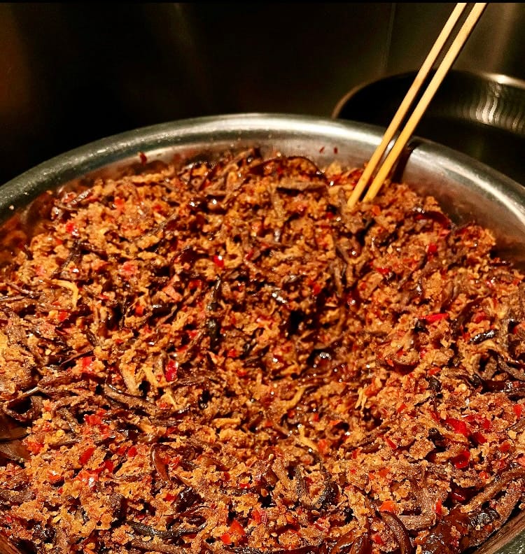 Using rice — long a staple food — as a fermenting seasoning agent is not unique to Yunnan. Across Southwest China, similar techniques appear. The Dai people ferment pork with glutinous rice to make sour meat. The Dong people ferment fish with rice to produce sour fish. Sichuan’s fen zheng rou (steamed pork with rice powder) can also be seen as a variation of zha. Some food anthropologists even trace sushi back to this tradition. The Japanese word sushi (すし), written in kanji as 鮓, originally referred to fish fermented with rice. Over time, it evolved into modern sushi, though vinegared rice still carries echoes of that fermented origin.