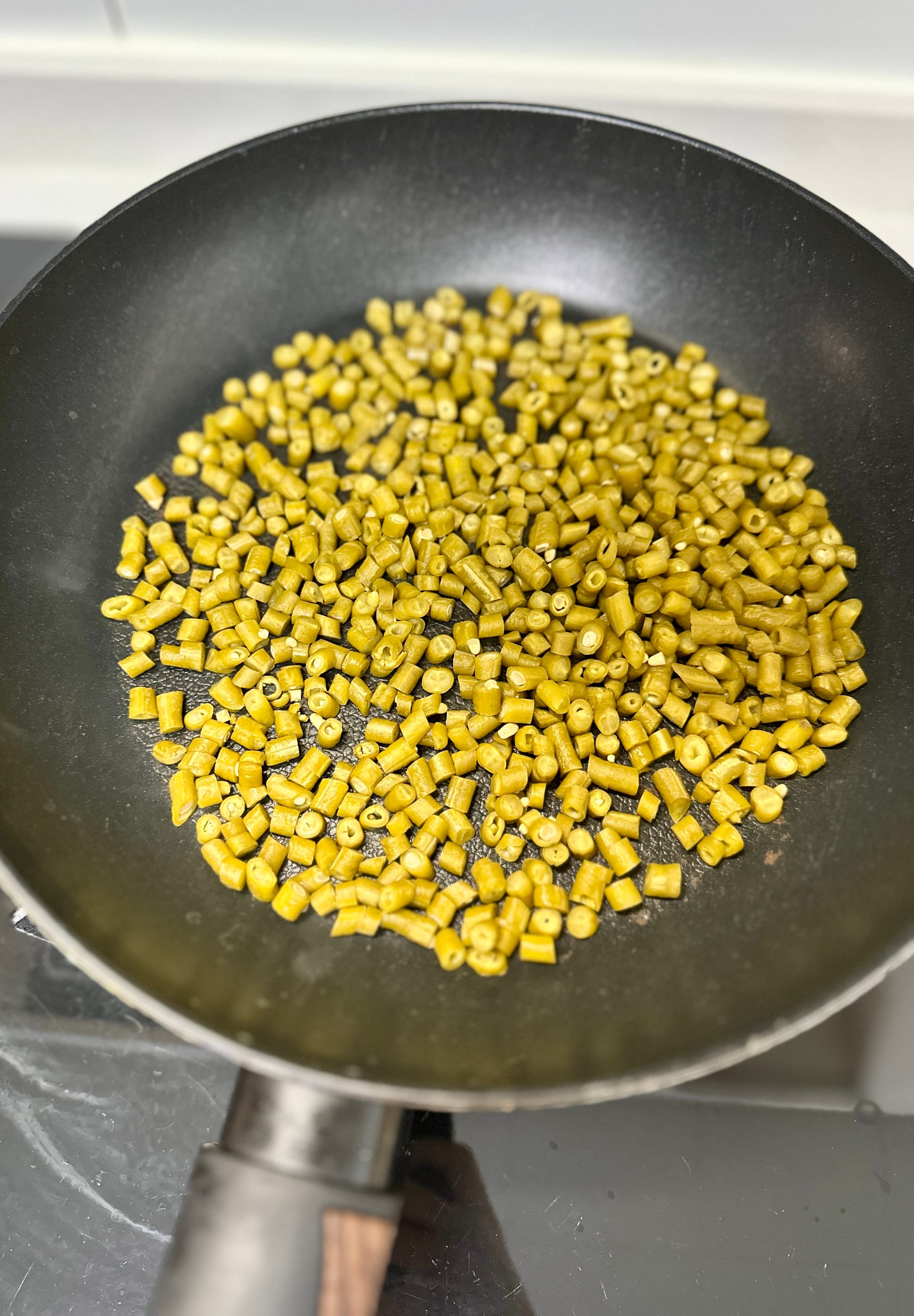 Prepare the beans — If very salty or sharp, rinse or soak briefly, then drain well. Chop long beans into 2–3 mm pieces, if the beans are too wet, toast them on the non-stick pan to let the moisture evaporate for a bit, 2min tops