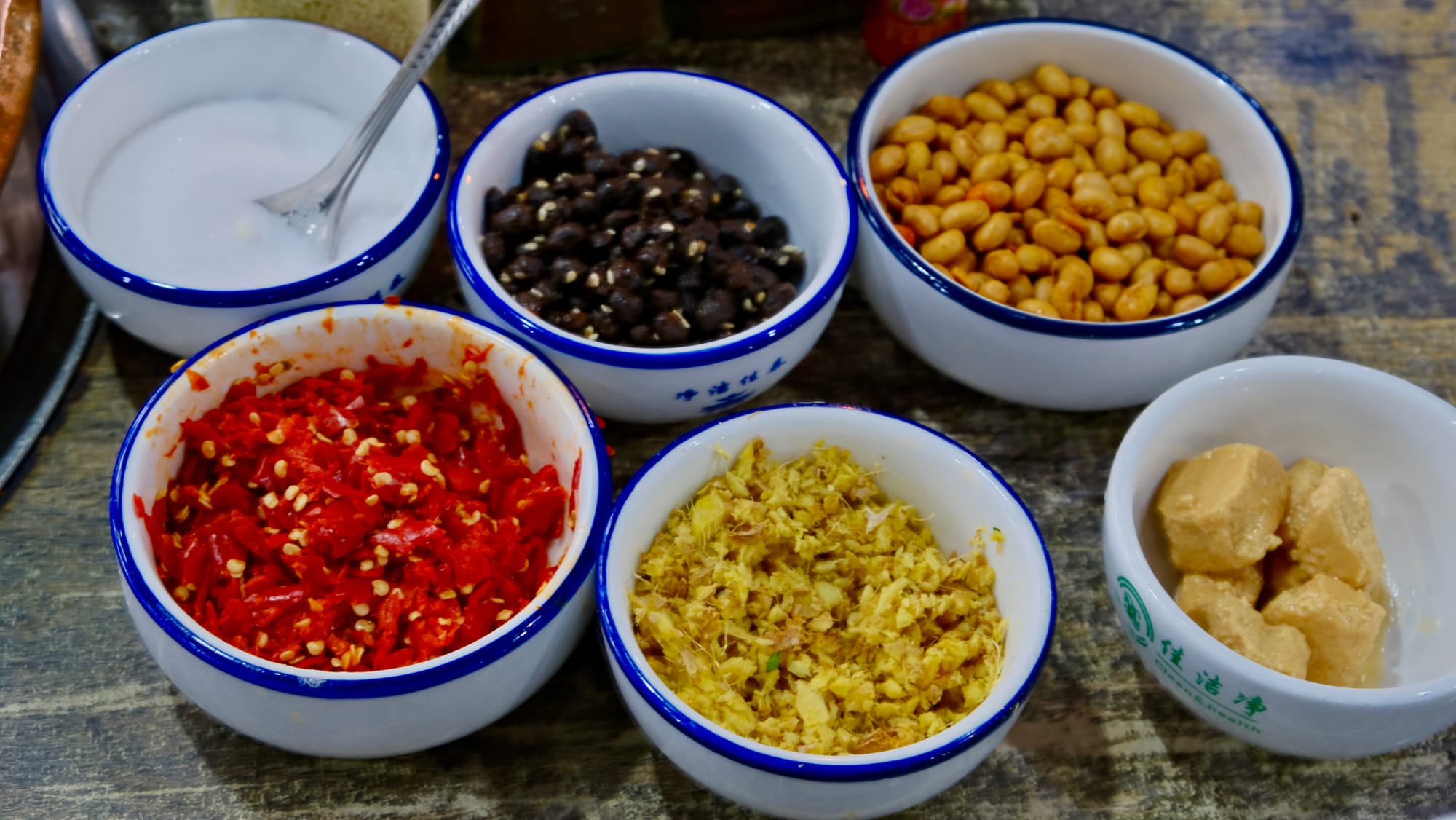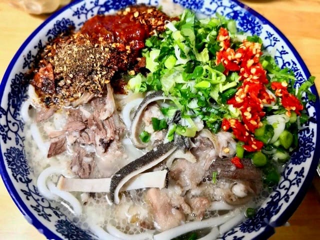 Goat rice noodles often rank at the very top of Huili’s breakfast favorites. Unlike rice noodles elsewhere, Huili’s noodles are thick, firm, and springy. At first glance, the dish looks deceptively simple: freshly blanched rice noodles, clear broth, and slices of white goat meat. Do not be disappointed too soon. The real journey begins with the condiments that follow. Ground and slightly burnt chili powder, fermented bean paste, fresh chilies, cilantro, minced ginger, scallions. All of them gather in a large, colorful bowl alongside the fresh goat meat and noodles. One bite is enough to warm your face and make you wish you had discovered it sooner.