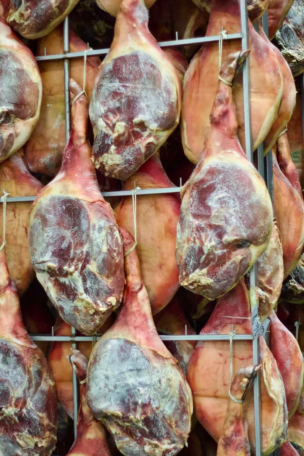 After salting, the legs move into a carefully managed air-drying phase at around 3–5°C, with humidity kept between roughly 55% to 90%. Airflow is intermittent rather than constant, because too much wind dries the surface too quickly and can cause cracking. One drying room alone can hold more than twenty thousand legs, a number that’s hard to grasp until you see the hanging rows in person.