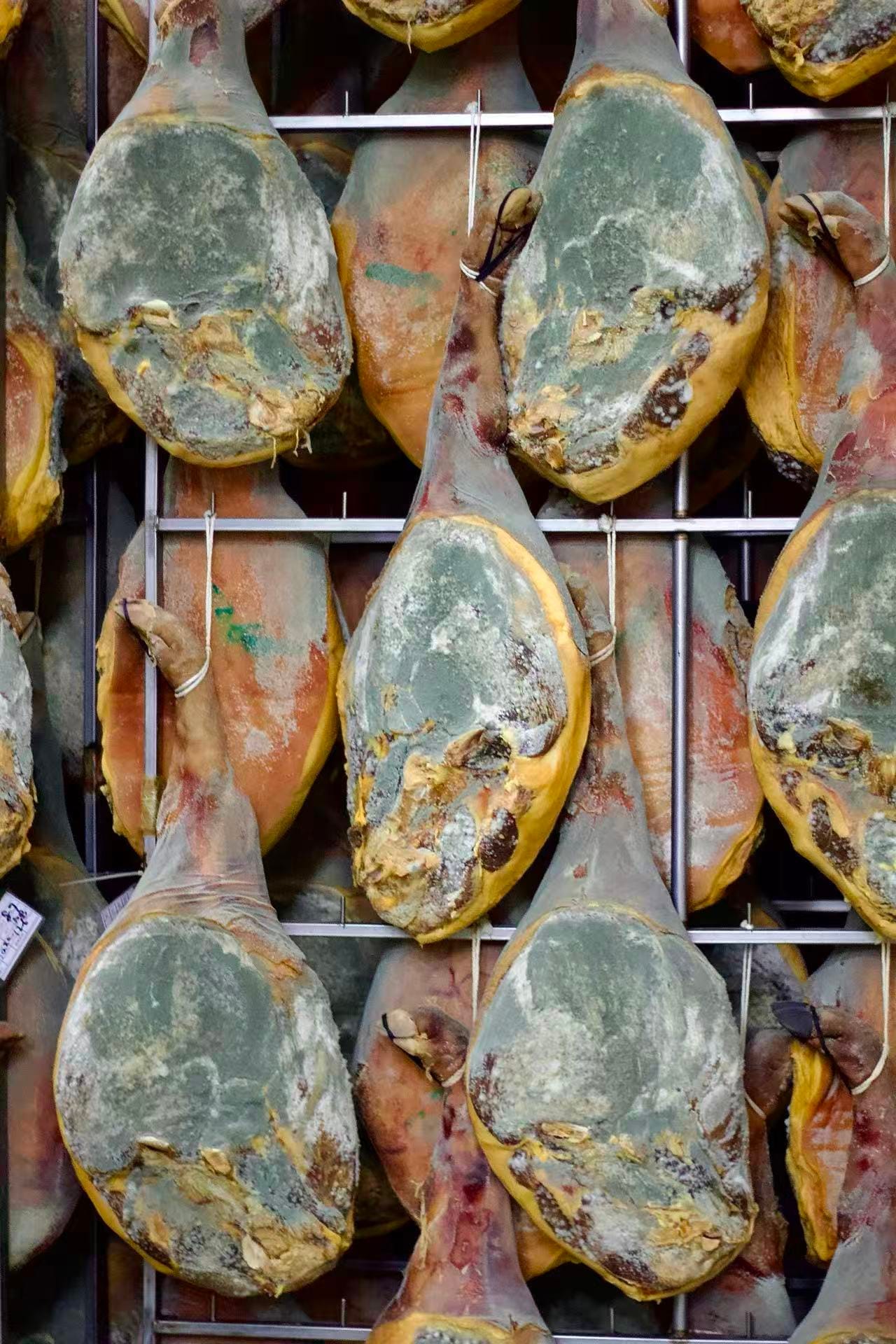 Near the end, the hams are encouraged to grow beneficial mold, which helps further break down proteins while reducing moisture loss. The mold is introduced through natural inoculation, supported by Jinhua’s long history of ham-making and its spore-rich air, before the legs finally mature into the finished product.