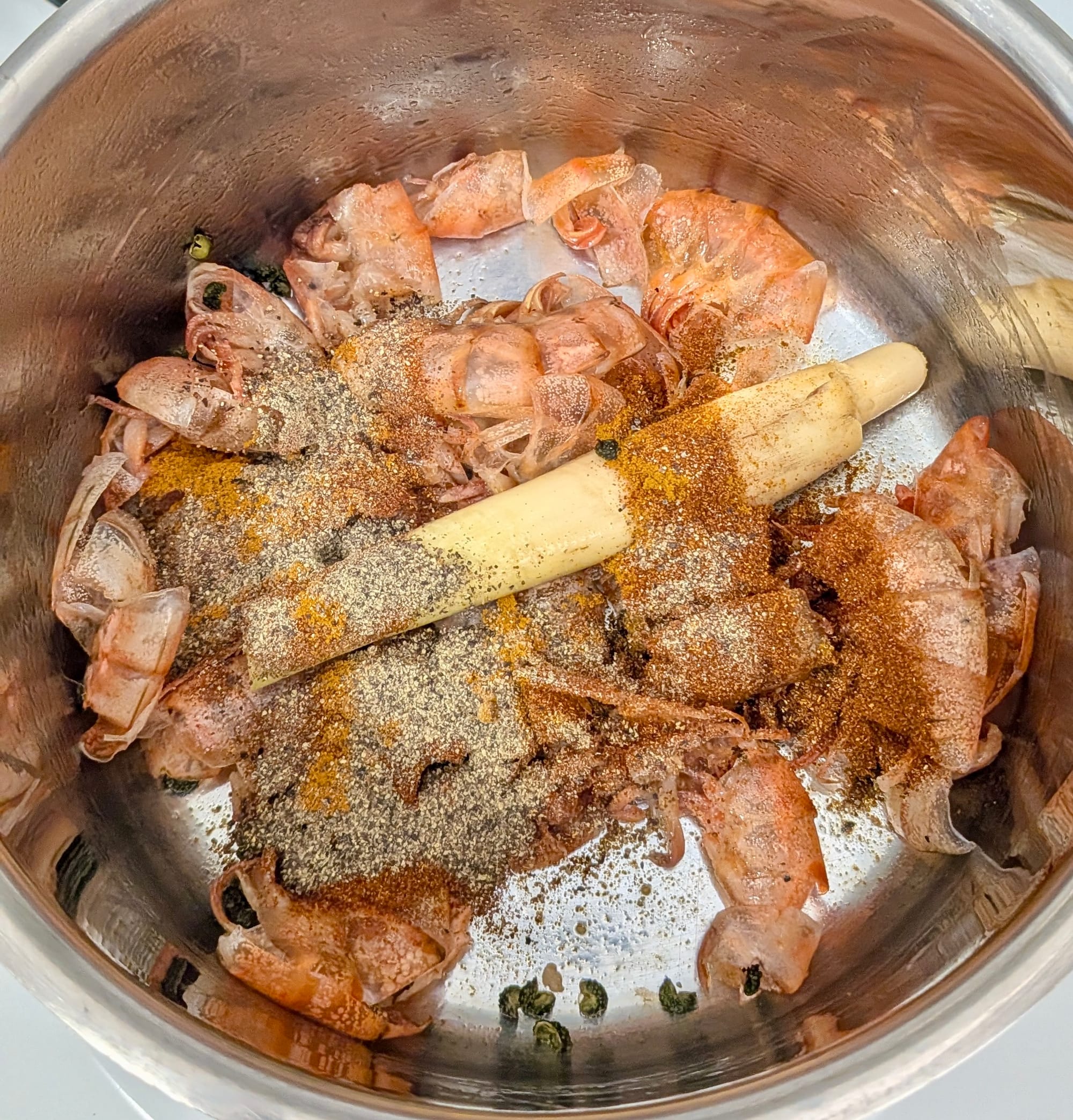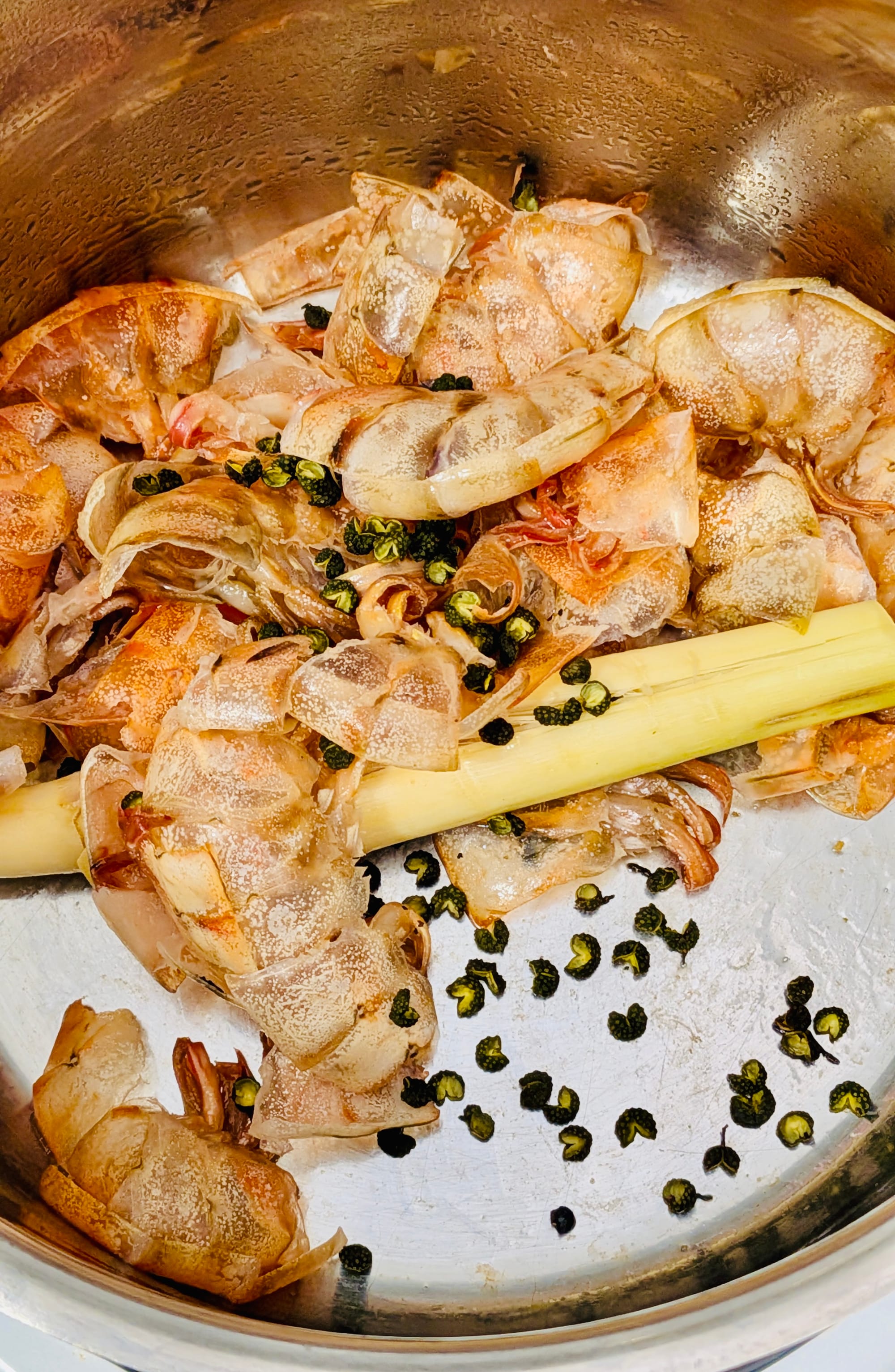 - The Stock: Heat a small pot on medium heat with 10ml (1/3) of the coconut oil. Add the prawn shells and cook until they turn pink. Add half of the Sichuan peppercorns and the crushed lemongrass. Once fragrant, stir in the black pepper, chili powder, and turmeric. Deglaze with 400ml of water. Simmer uncovered for 15–20 minutes, then strain, pressing the shells firmly to extract all the flavor.