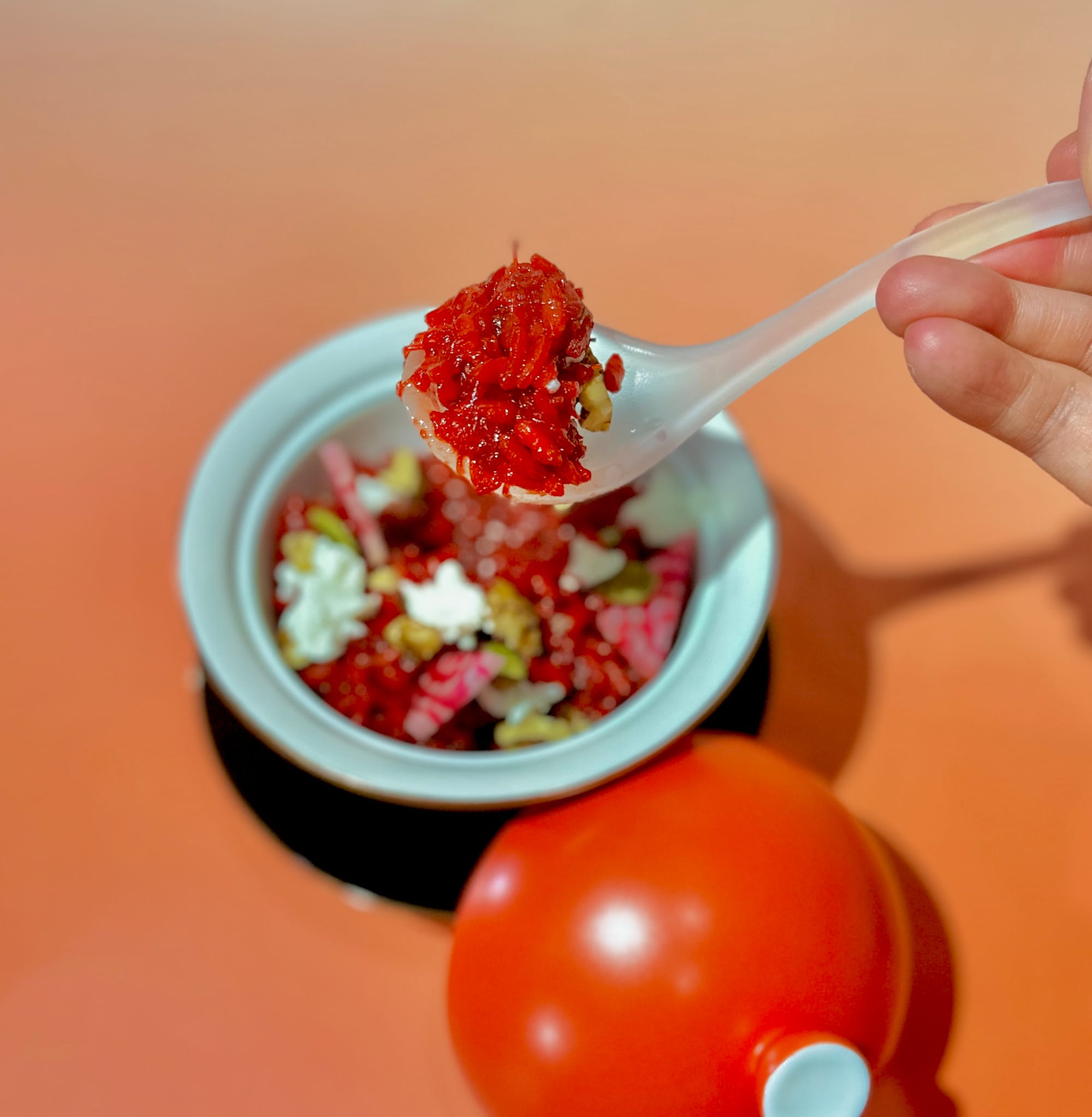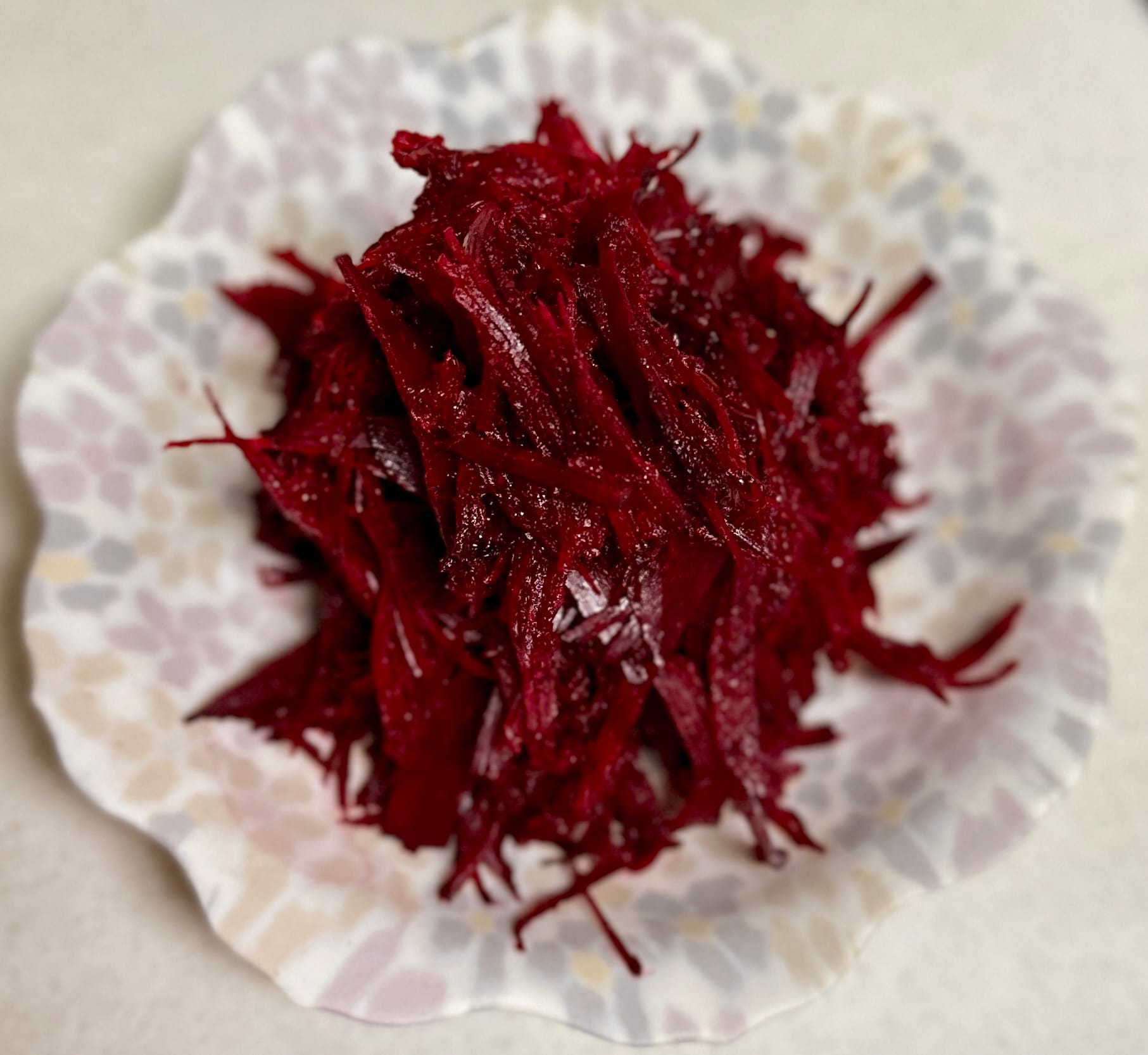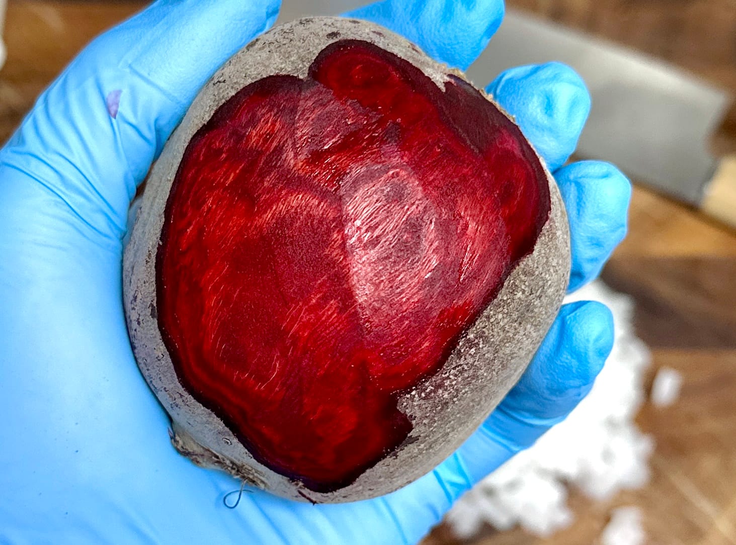 - Slice the beet — Trim one end to reveal the ring pattern. Slice into 1 mm rounds using a mandolin.