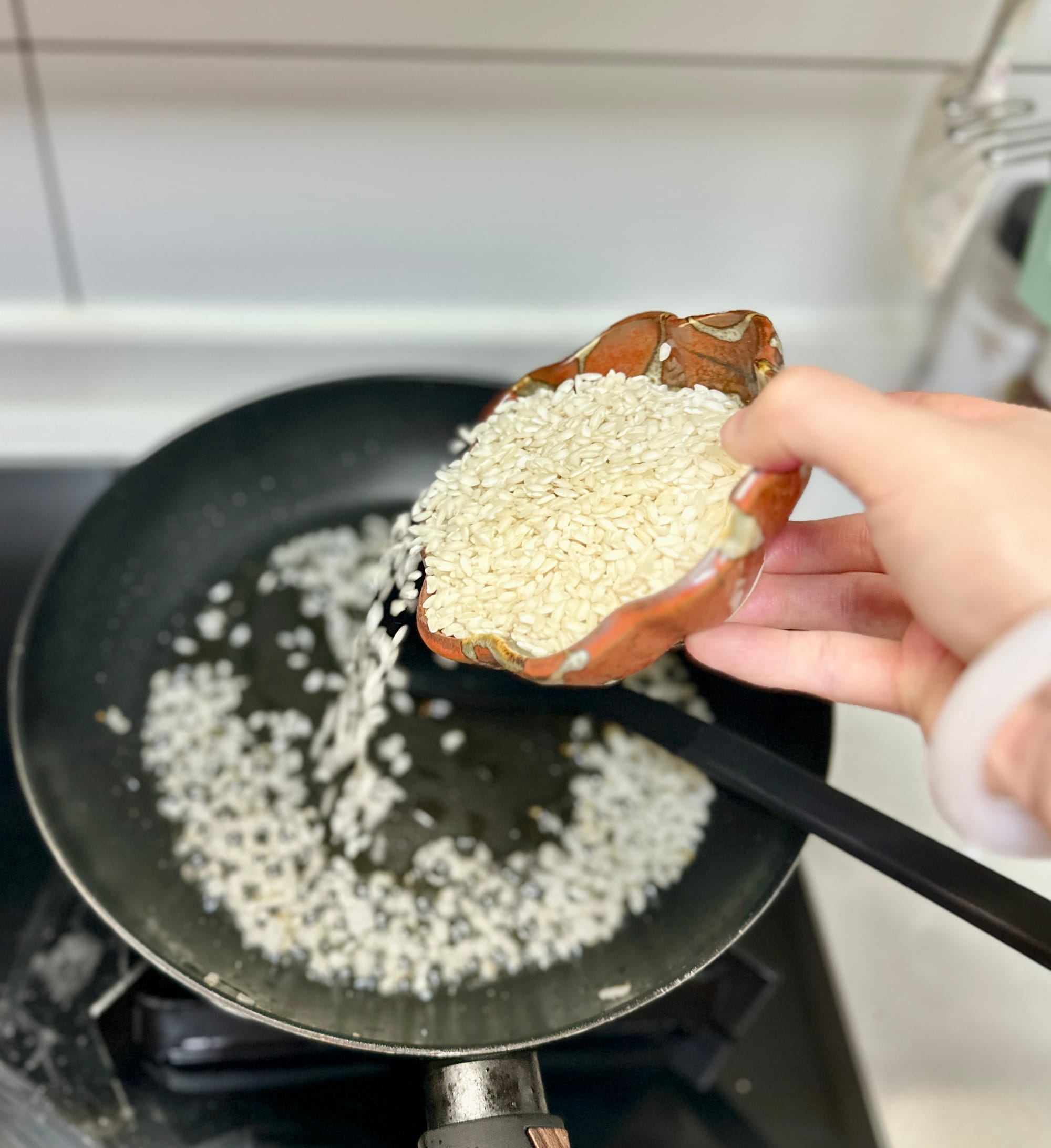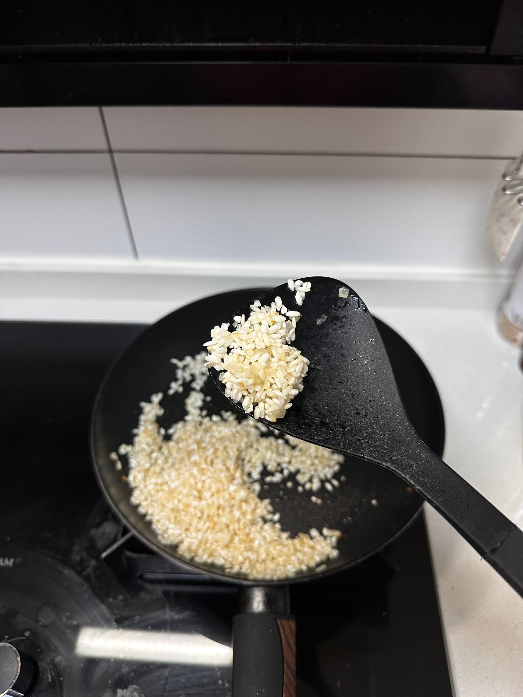 - Nacrer the rice — Add Arborio rice. Stir until grains are coated and partially translucent.