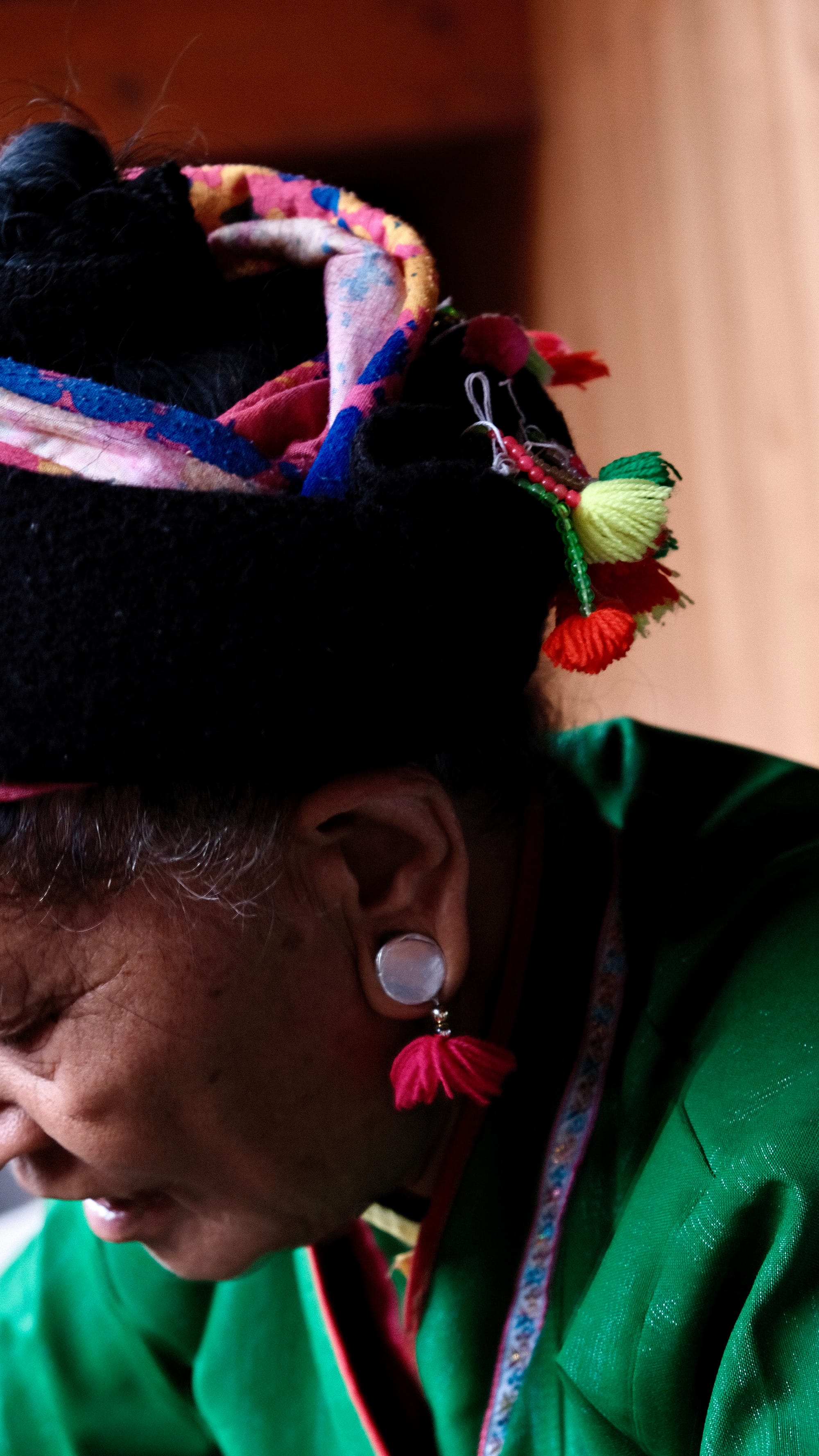 The wool pom poms hanging from the brim symbolize “tea seeds.” Dried tea leaves are sorted by hand to ensure quality.