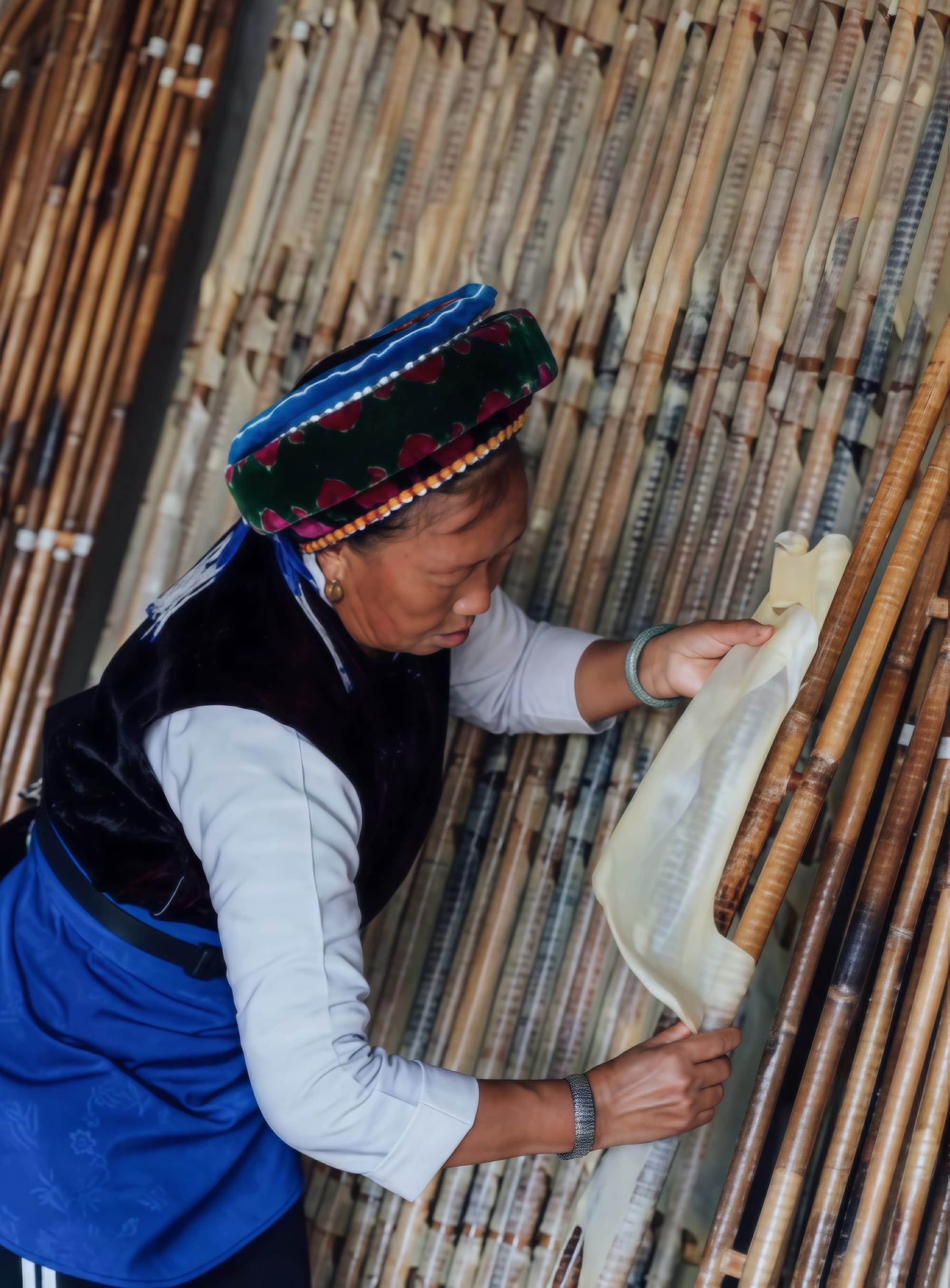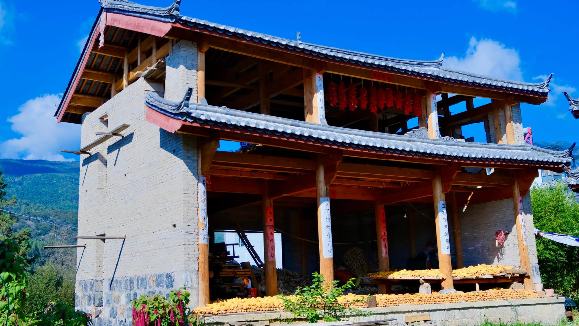 Bai women hang sheets of rushan to dry. Rushan is a traditional Bai food made by adding hot papaya juice to cow or goat milk. The milk curdles and is shaped into fan-like sheets before being dried on a wooden frame. We pass an abandoned village house that has been turned into a granary where grains are dried in the sun.